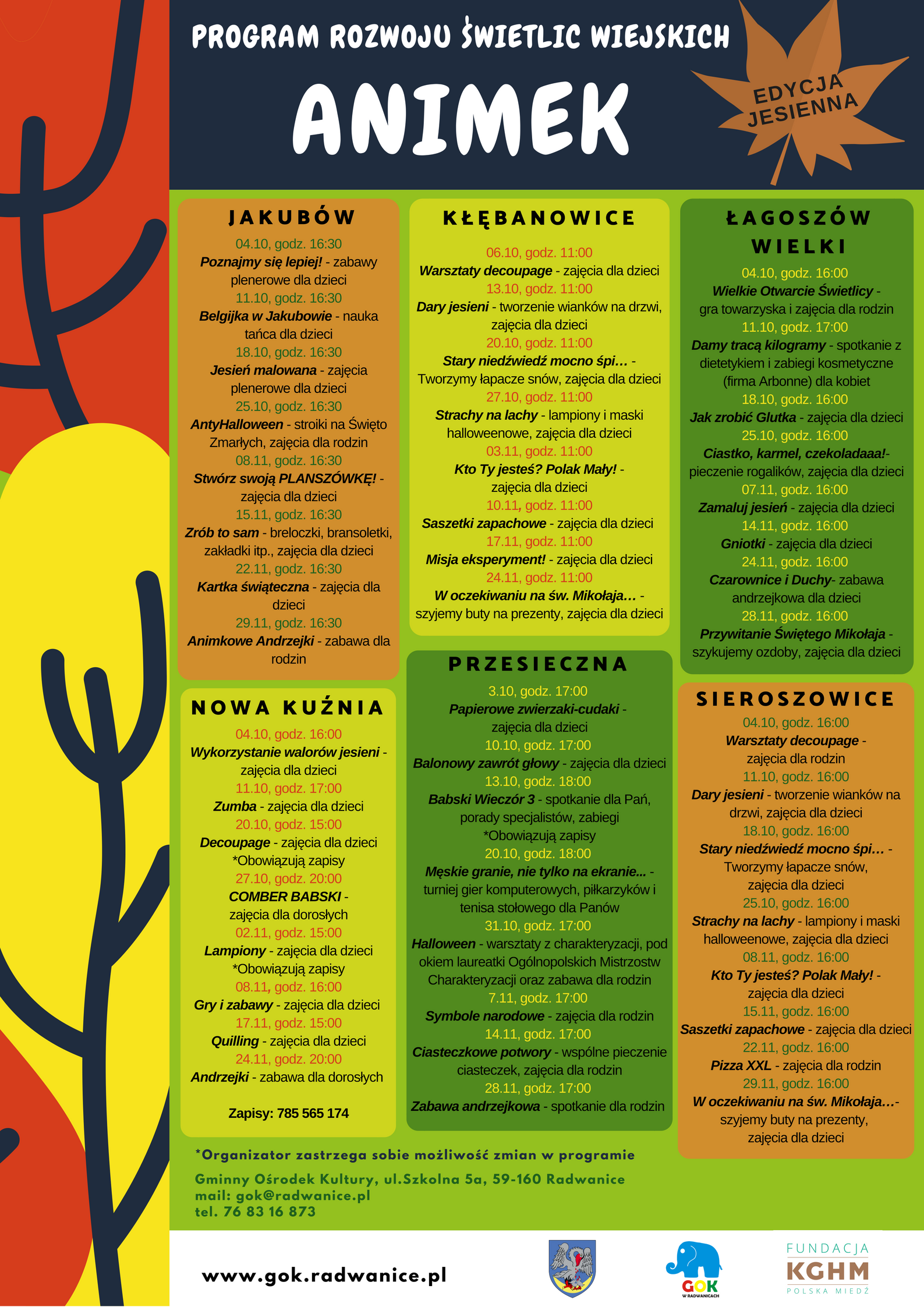 Od 1 października do 30 listopada Gminny Ośrodek Kultury w Radwanicach, dzięki darowiźnie otrzymanej od Fundacji KGHM Polska Miedź S.A. oraz przy wsparciu finansowym Gminy Radwanice, realizował jesienną edycję Programu Rozwoju Świetlic Wiejskich „ANIMEK”.